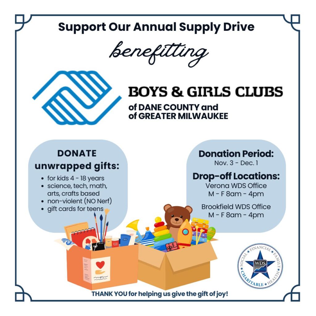 This year, we’re hosting our annual supply drive to support the incredible work of the Boys & Girls Clubs—and we need your help! We’re collecting new, unwrapped holiday gifts to benefit children and teens served by the Boys & Girls Club of Dane County and the Boys & Girls Club of Greater Milwaukee.